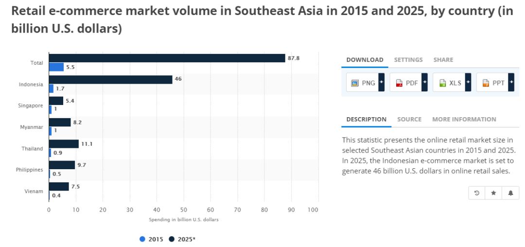 Statista数据显示,到2025年,东南亚地区主要国家(印度尼西亚、泰国、新加坡、马来西亚、越南、菲律宾)的电子商务在线零售市场规模总计将达到878亿美元。