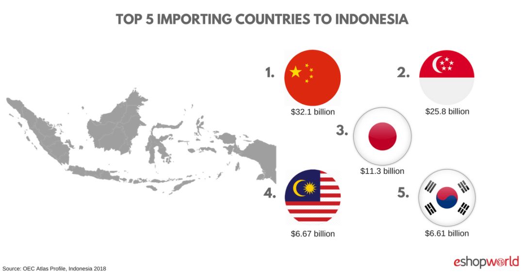 在进口贸易上,印度尼西亚的主要进口产品国是中国、新加坡、日本、马来西亚和韩国。