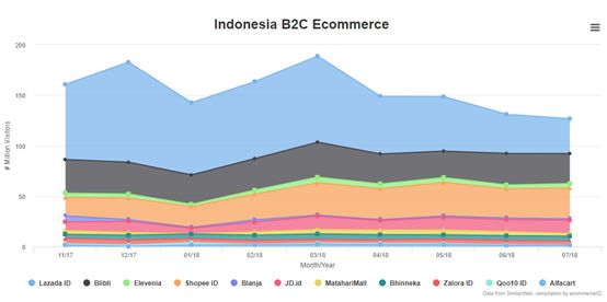 在电商网站上,印度尼西亚最热门的电商网站是Lazada ID、Blibi、Elevenia、Shopee ID、Blanja。