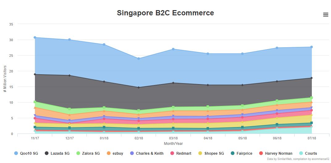 目前,新加坡排名前五的电商平台为:Qoo10 SG 、Lazada SG、Zalora SG、ezbuy、Charles and Keith。