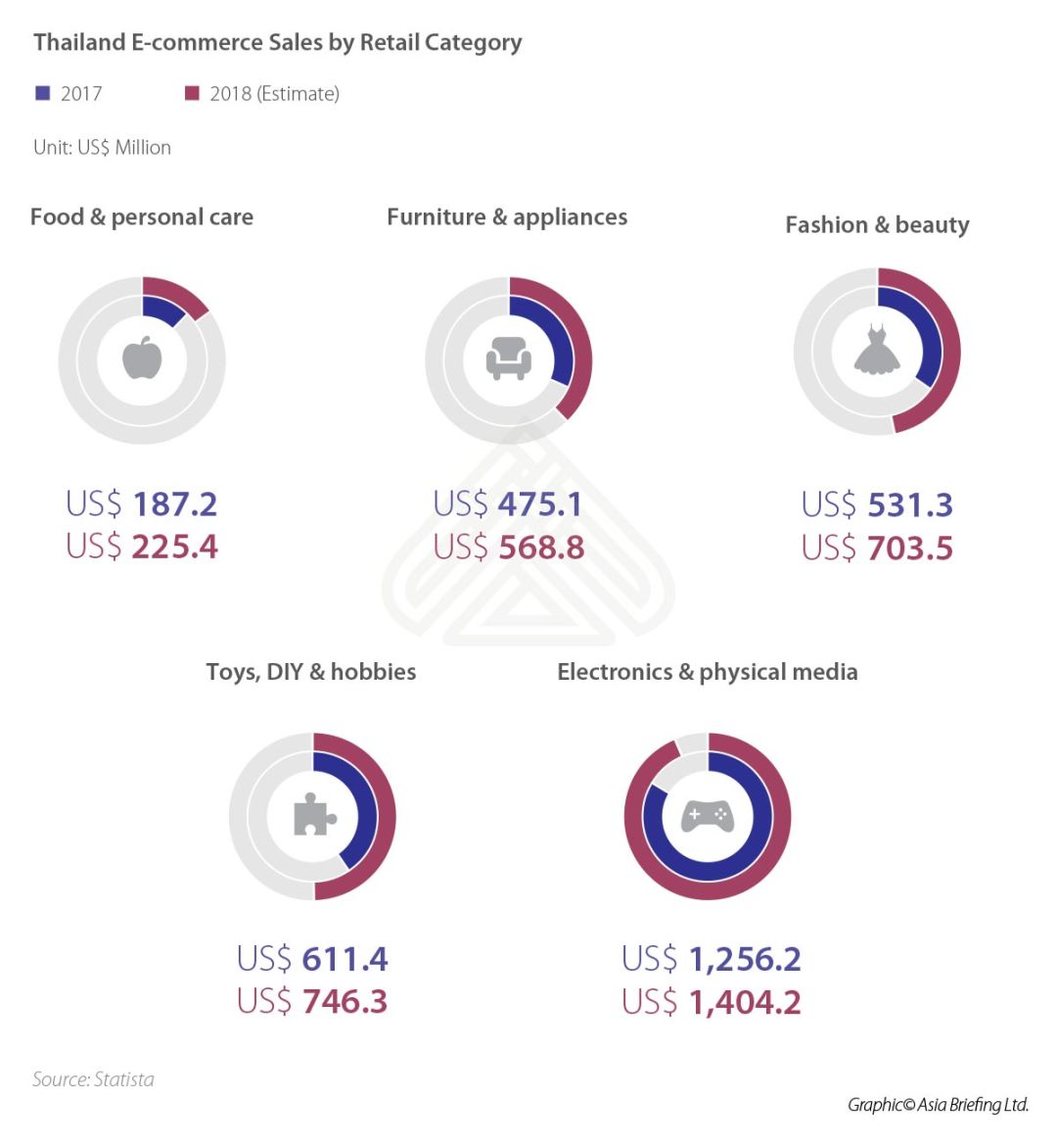玩具、爱好和手工品类(Toys、Hobby & DIY 品类)是泰国电子商务行业的第二大市场。随着该国在线游戏和手机游戏的不断增加,该行业预计将实现强劲增长。其次是时尚品类、家具和电器品类、食品和个人护理品类。
