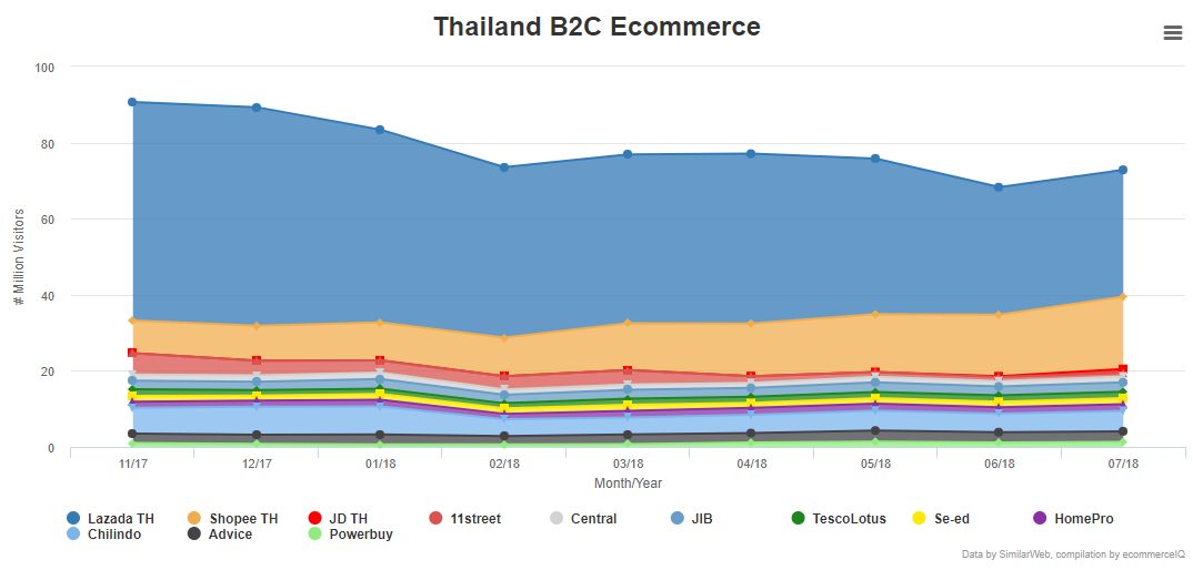 在泰国,最热门的电商网站是:Lazada TH、Shopee TH、JD TH、11street、Central。