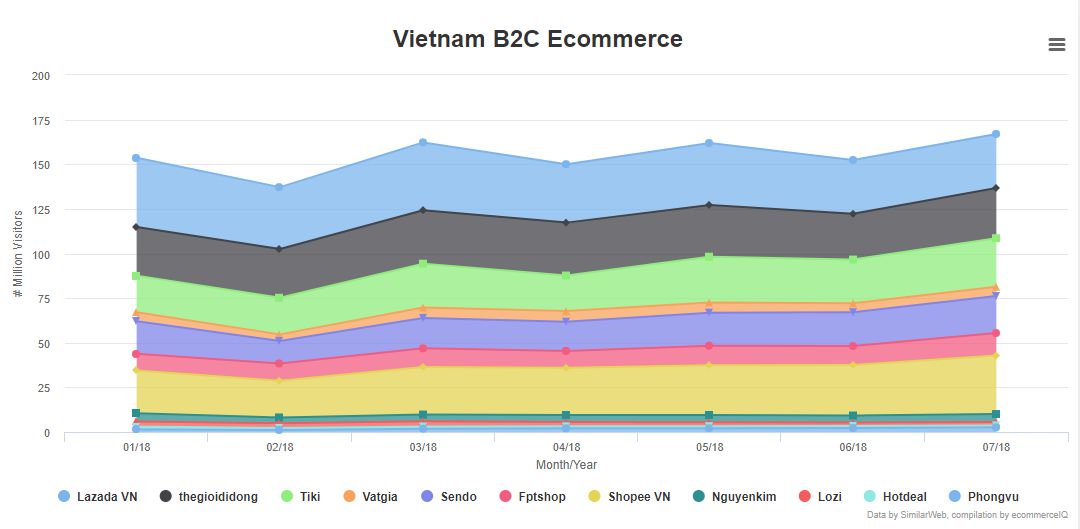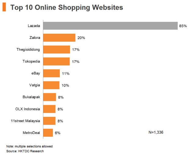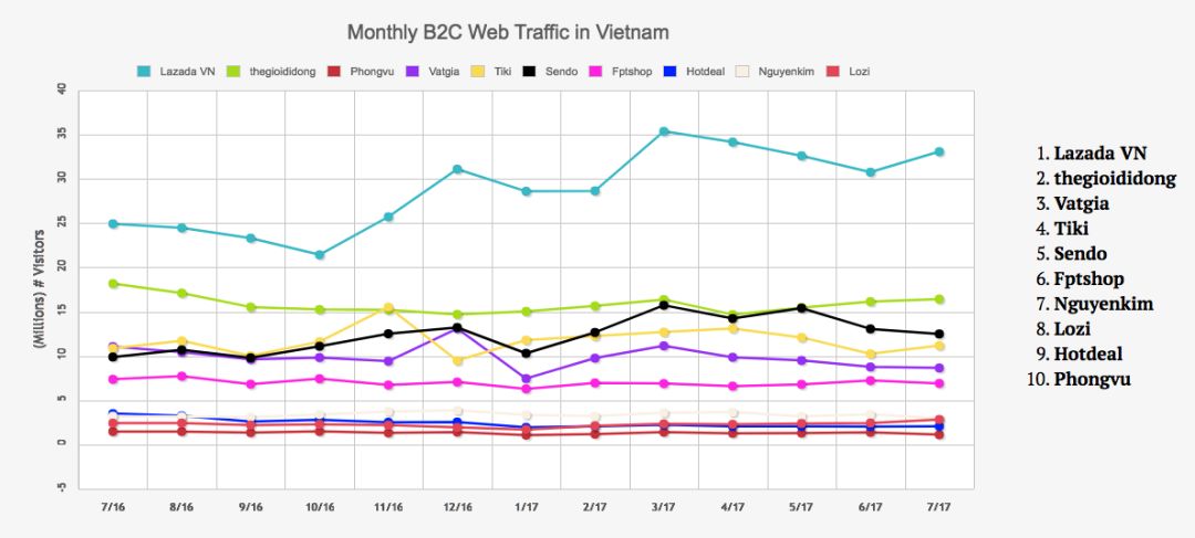 在越南,最热门的电商网站是Lazada VN、thegioididong、Tiki、Vatgia、Sendo。
