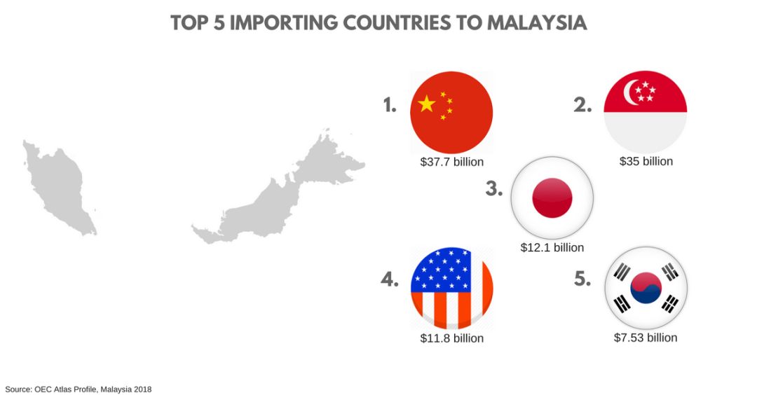 马来西亚的主要进口伙伴是中国、新加坡、日本、美国和韩国,其中中国为马来西亚提供的进口产品贸易额最高,为377亿美元。日本为121亿美元,美国为118亿美元,韩国为75.3亿美元。