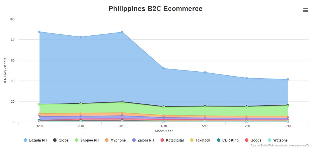 在东南亚地区的电商市场中,菲律宾是唯一一个Lazada占主导地位的市场,Lazada的每月访问次数达到3500多万次,市场竞争力非常大。