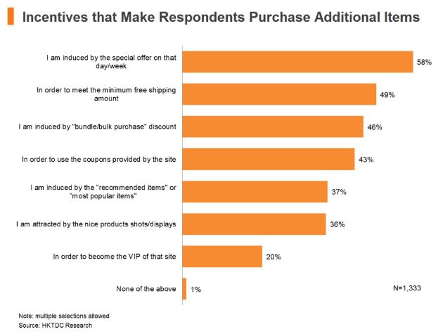 在调查中,58%的消费者表示“特别优惠”是他们在线购买额外产品的最大动力。除“特别优惠”外,49%的消费者将“免费送货”列为可能额外购买的因素。其次,“批量折扣”和“优惠券”也各占46%和43%的比例。此外近40%的消费者还表示,向他们发送“您可能也喜欢”或“最受欢迎的商品”消息,也可能会促使其额外购买。