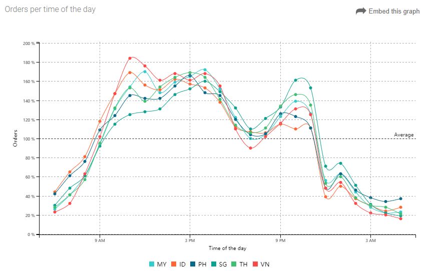 根据 iprice 发布的数据,订单数量平均在上午9点到下午5点之间最高,这段时间一般是上学或上班的时间。只有新加坡人例外,他们在晚上10点钟的订单量达到高峰(161%)。