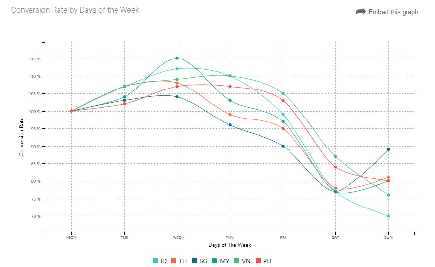 1、以周一为基础值,整个东南亚地区的电商卖家在周末的转化率都在持续下滑,跌幅高达30%;