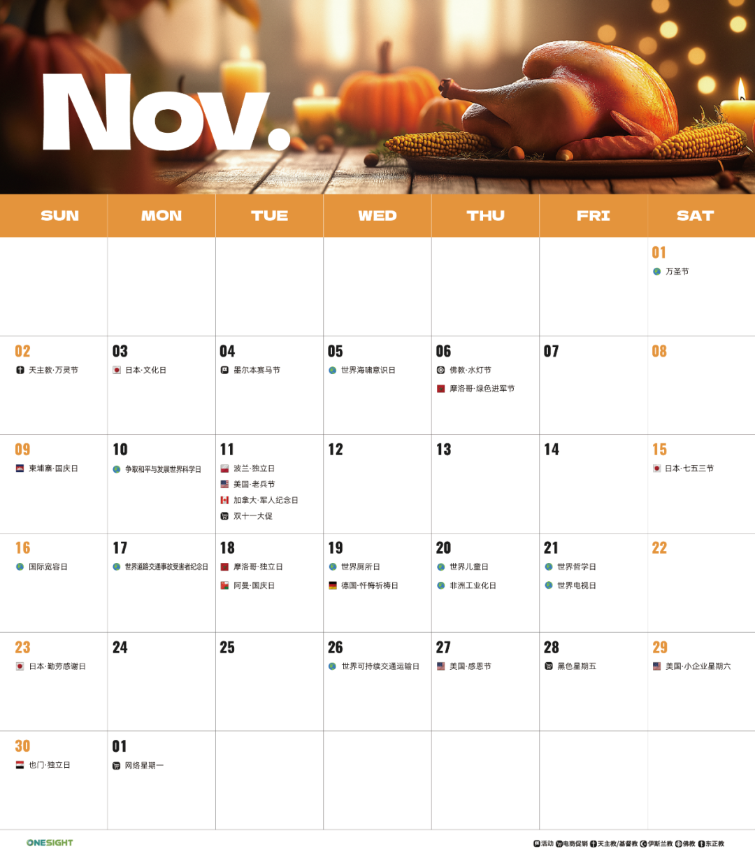 11月海外营销日历:感恩节,黑五网一,世界儿童日, 世界可持续交通运输日,国际宽容日...