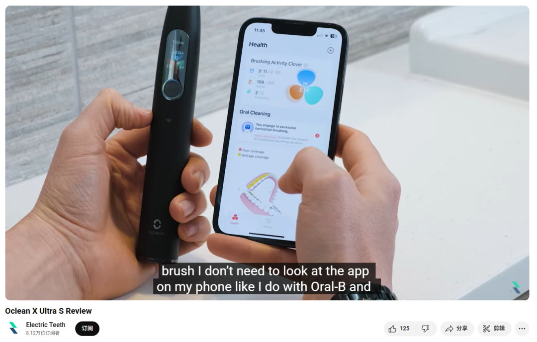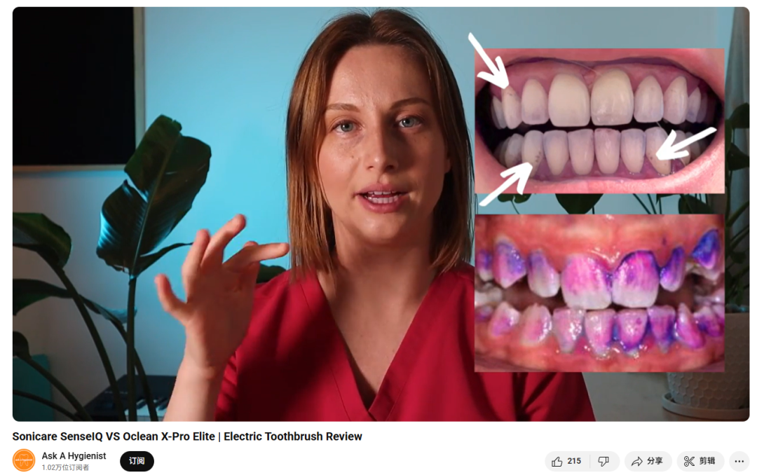 专业权威先 “背书”:在 YouTube,专注口腔测评的博主@Electric Teeth花 12分钟实测 Oclean X Ultra S—— 用牙菌斑显示液对比,证明它的清洁力和飞利浦相当,还直言 “屏上实时反馈比竞品做得好”;牙科保健师 @Ask A Hygienist 更直接,把 Oclean X Pro Elite 和 379 美元的飞利浦 Sonicare 放一起比:“同样的清洁效果,Oclean 只要 100 美元,续航还比它多 21 天。”