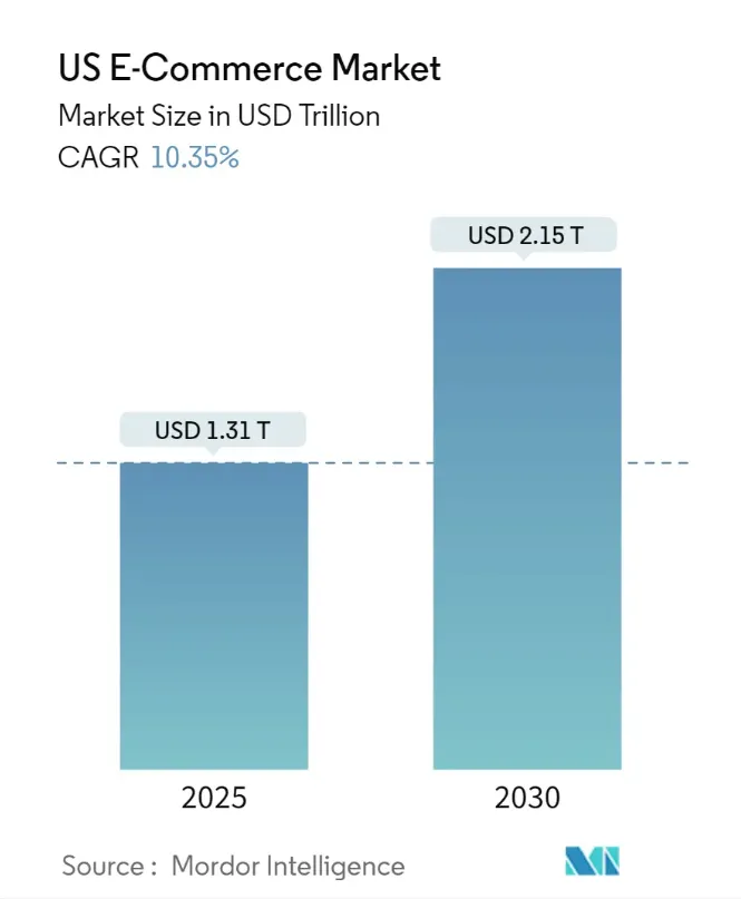 得益于庞大的消费群体基础和成熟的多元化供应商生态,美国电商市场高度繁荣。据Mordor Intelligence数据显示,至2025年,美国电商市场规模估计为 1.31 万亿美元,预计2025年至2030年的复合年增长率为10.35%。