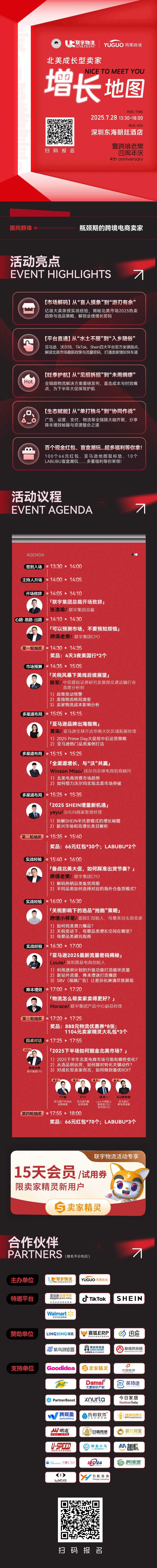 这些问题的答案,将在深圳这场高价值、高质量、高规格的线下交流活动中揭晓。7月28日,由联宇物流和雨果跨境联合主办的“北美成长型卖家增长地图暨跨境老樊四周年庆”活动,将在深圳东海朗廷酒店举行。