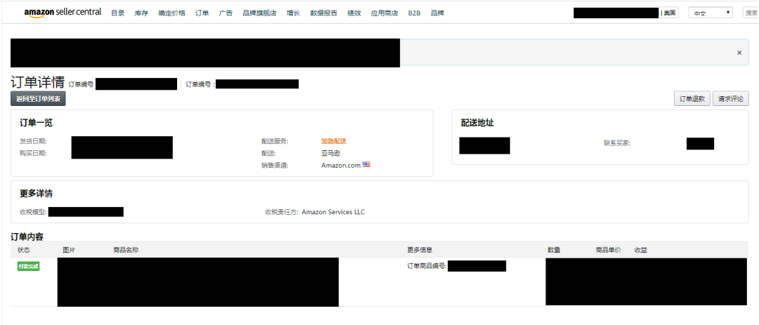 这张从亚马逊截下来的图片清楚显示网店收到的订单详情,包括客户、销售货物、交易金额、收款及物流状态,为银行提供清晰的公司营运状况。