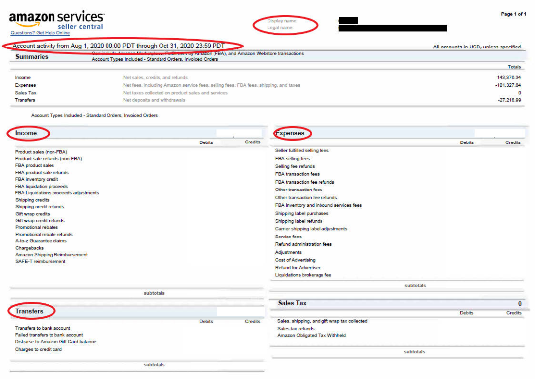 以下从亚马逊下载的月销报告,显示网店的销售收入、平台支出、及资金转出纪录,让银行了解公司的资金流。