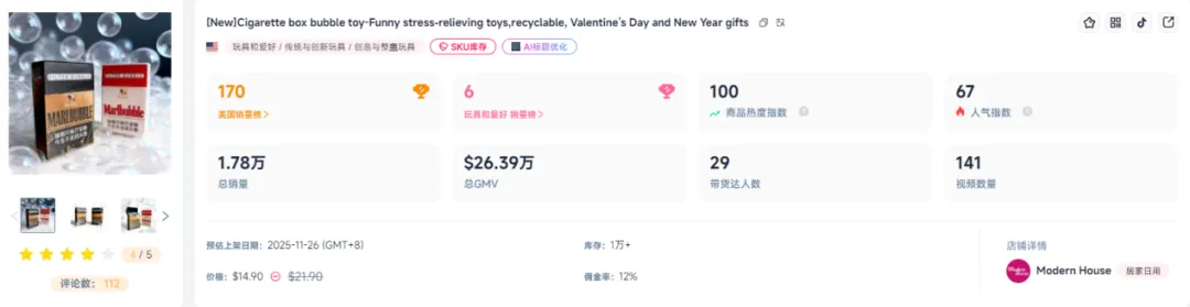 又见爆款!近日一款以香烟为外观设计的泡泡玩具在TikTok美区上走红,上架不到一个月就卖出了1.78万件,累计销售额达26.39万美元(约合人民币185万),相似产品在国内采购平台售价3元左右,说一句赚翻了也不为过~