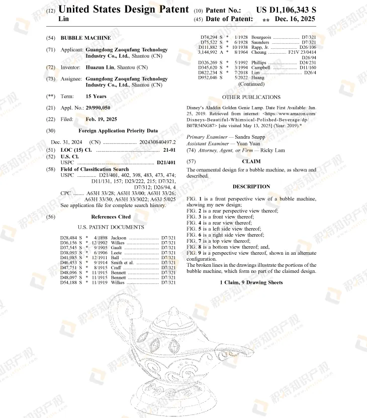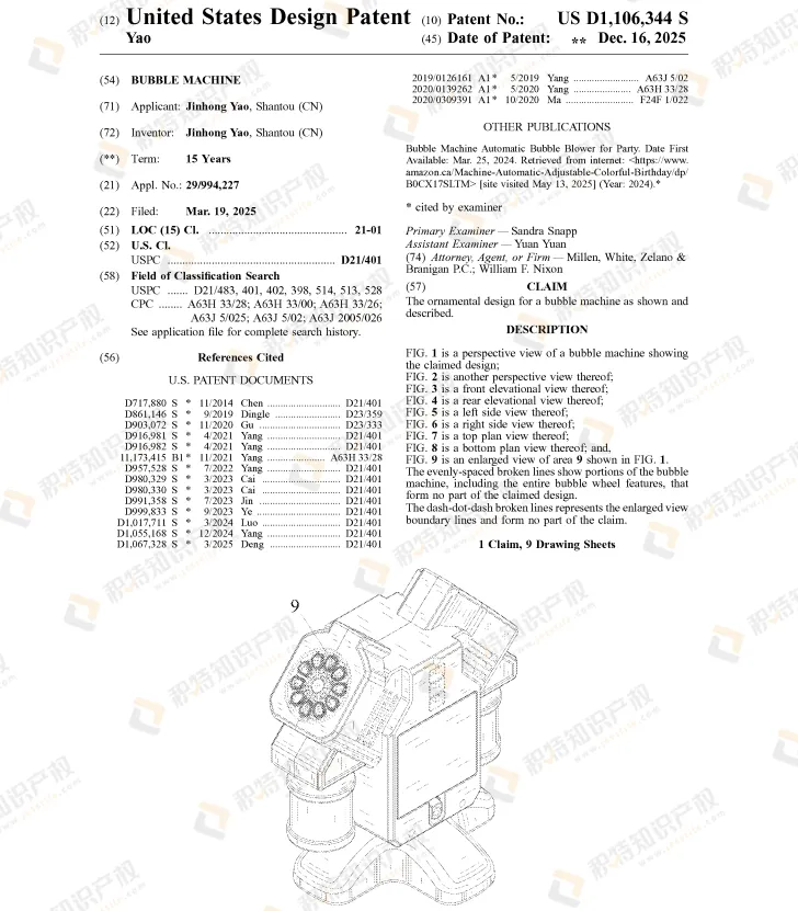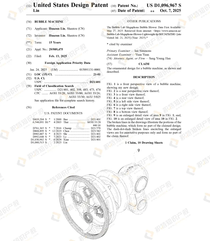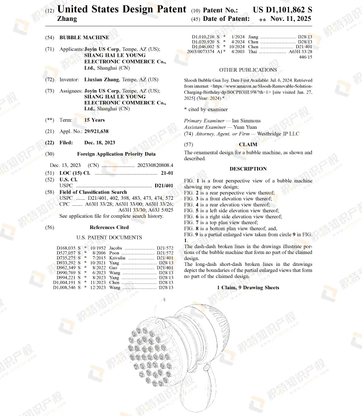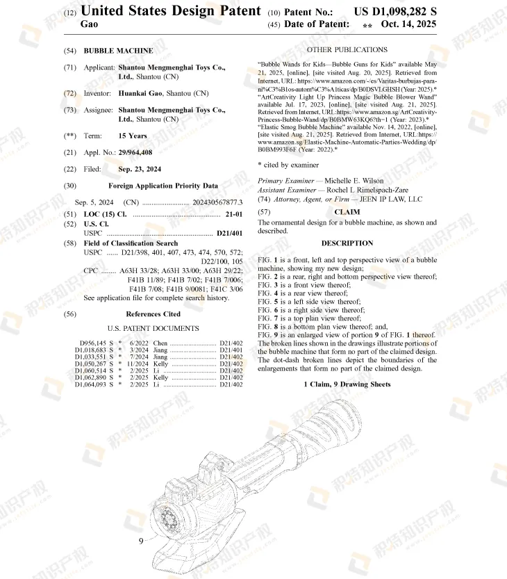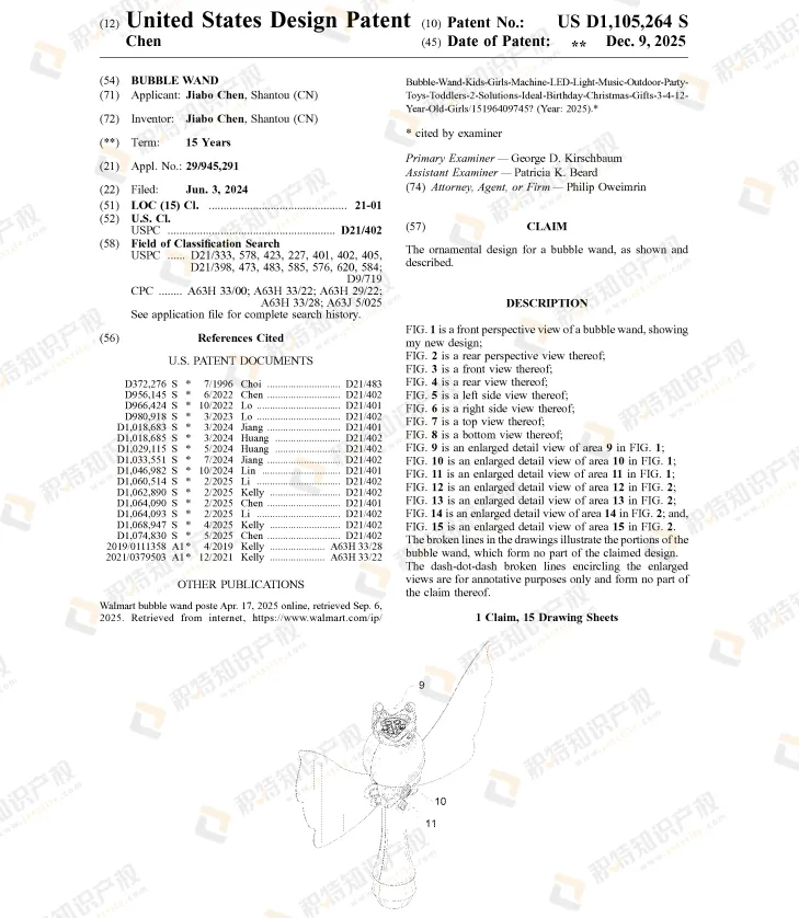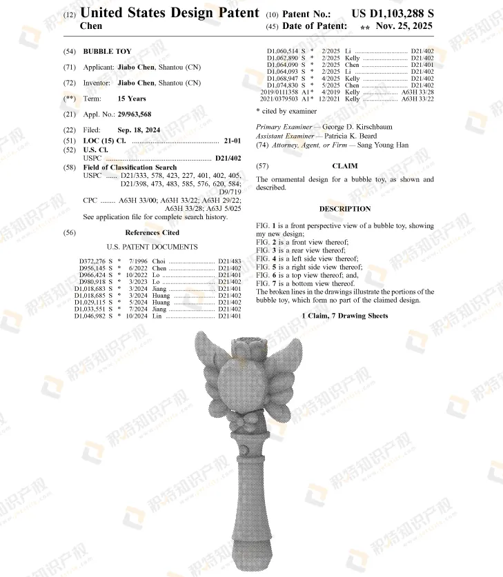 热销背后往往藏有侵权风险,泡泡玩具也不例外。虽然暂未查询到上述香烟泡泡玩具的美国外观专利(不排除在申请中的可能),但光是今年下证的泡泡玩具美国外观专利就不少,若是没有提前进行专利检索,很容易会踩中侵权坑,想要进入市场的卖家一定要注意!