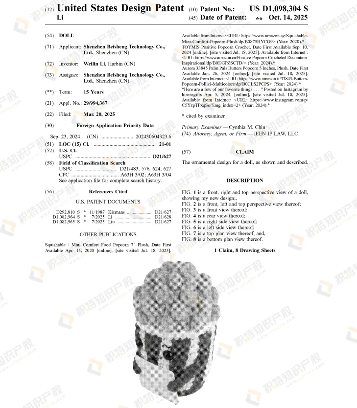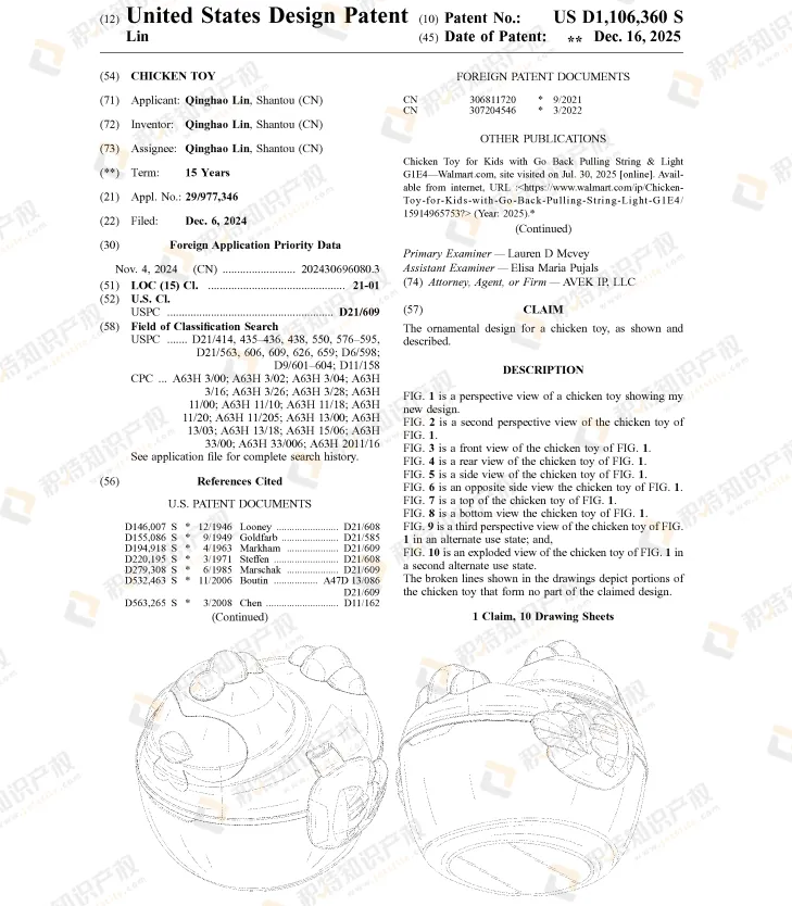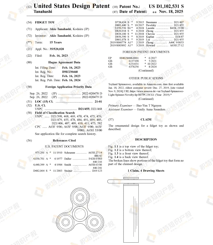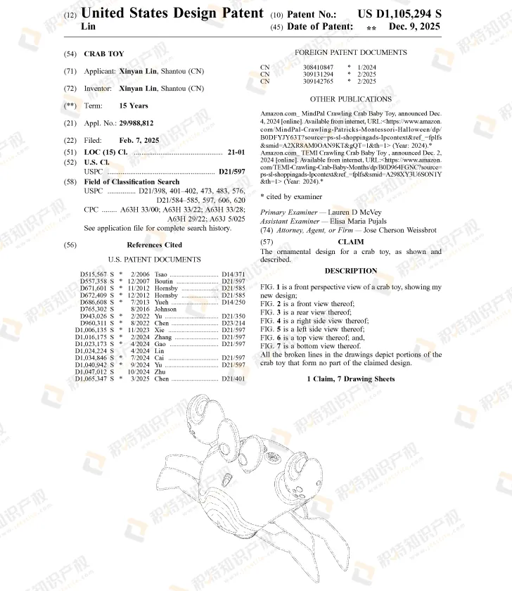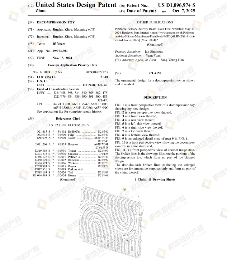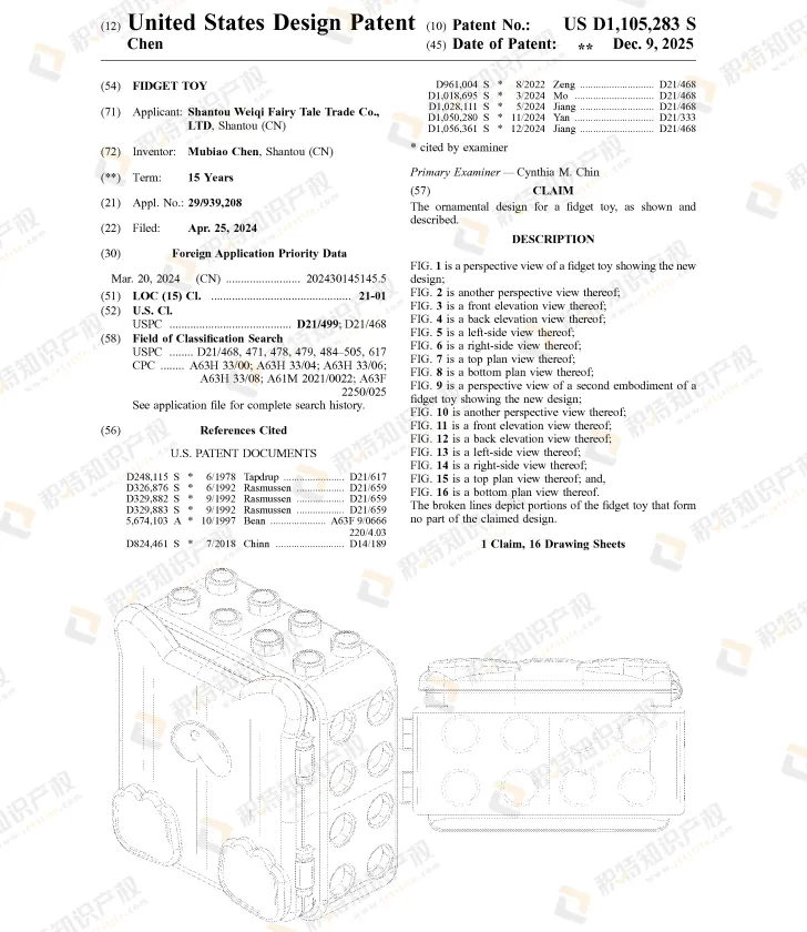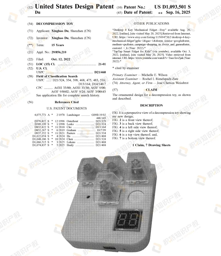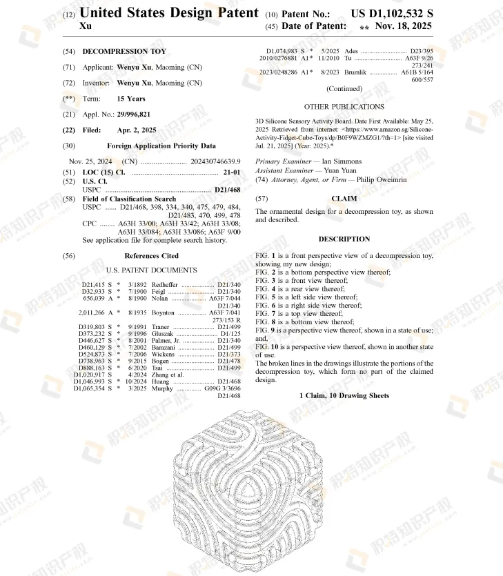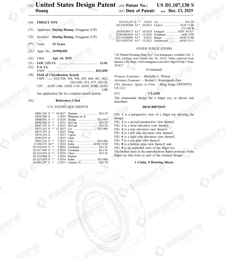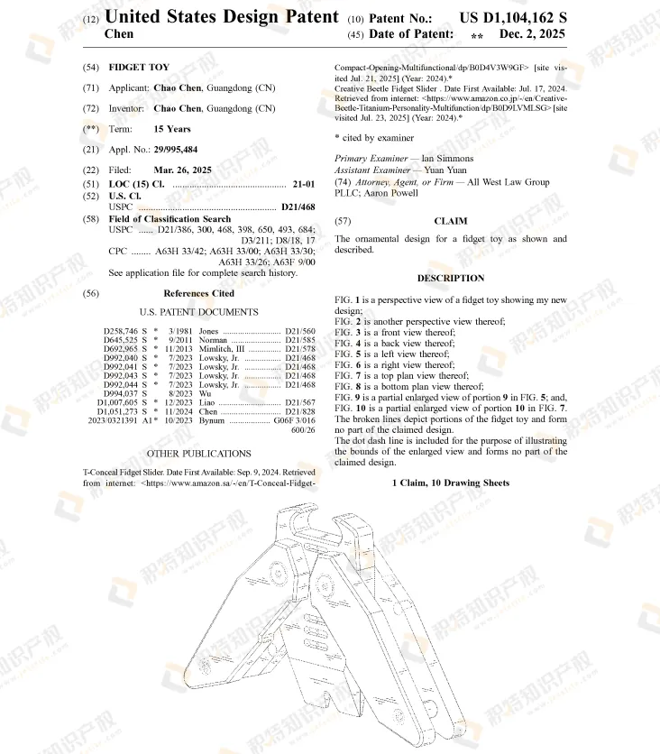 最近就有一款热销解压玩具下证美国外观专利,专利名称Fidget toy,专利号USD1107130S,2025年12月23日下证,亚马逊上有不少相似产品在售,且个别带有该产品的链接月销过千: