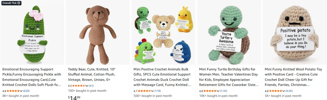 针织玩偶不仅可爱,还兼具实用性和情感价值,无论是自用、送人还是装饰家居,都能带来独特的温馨感,亚马逊上各种款式产品都颇受欢迎。