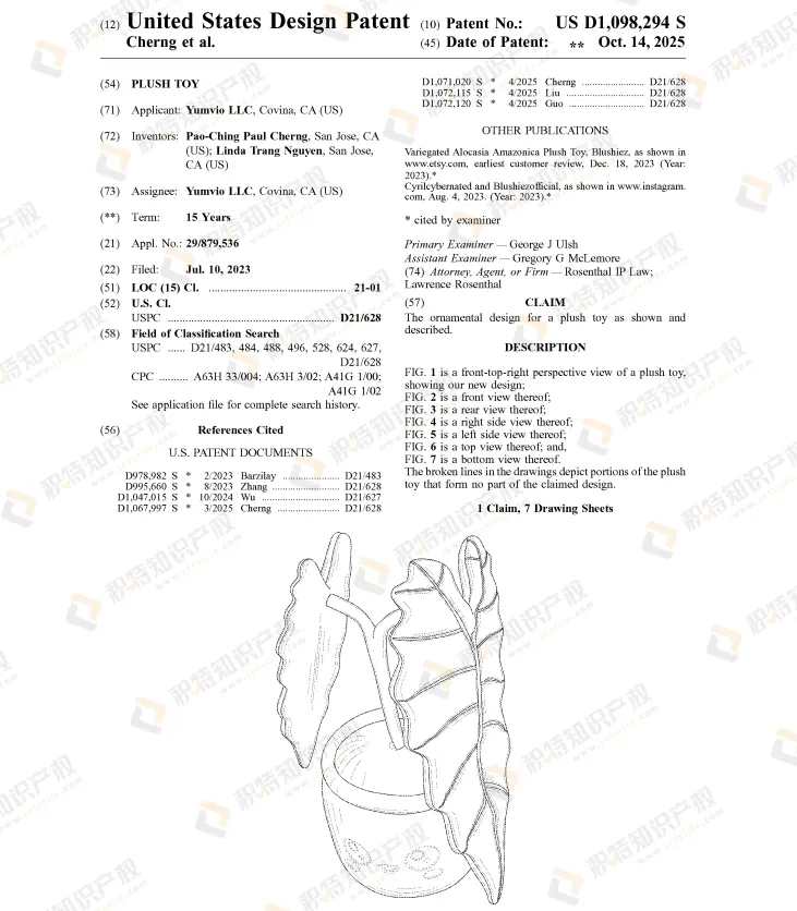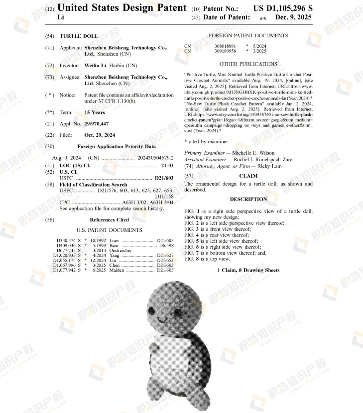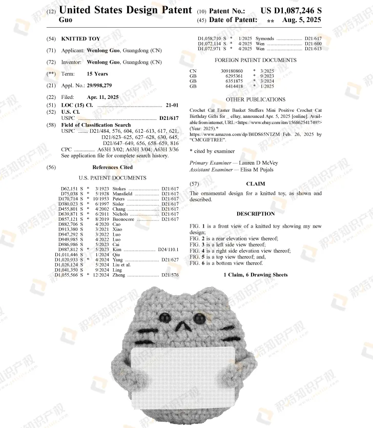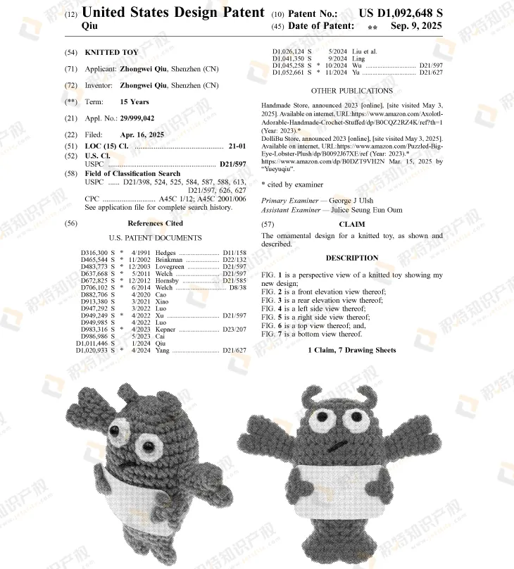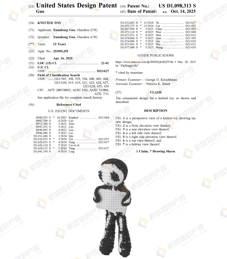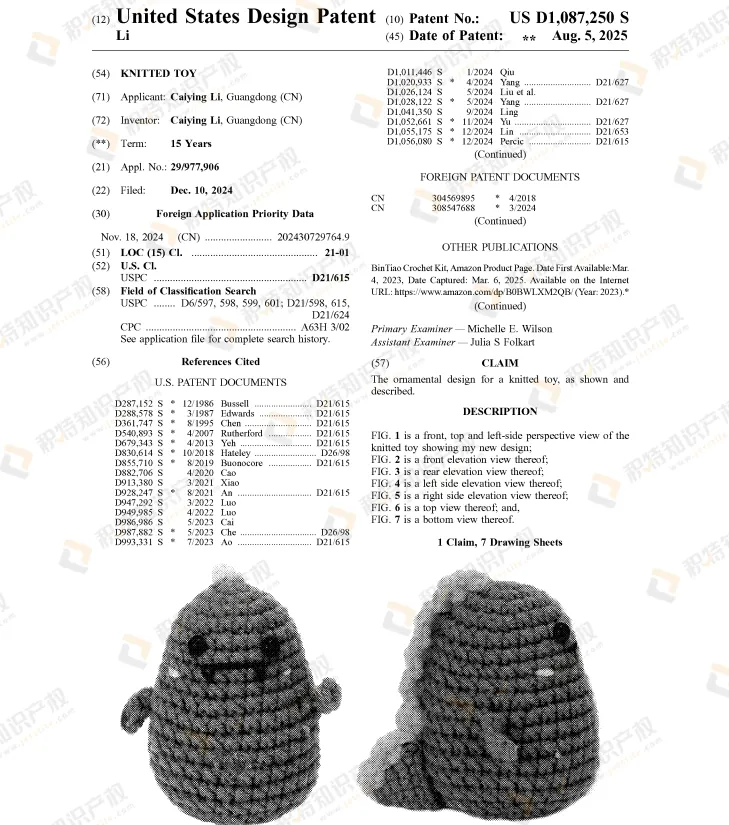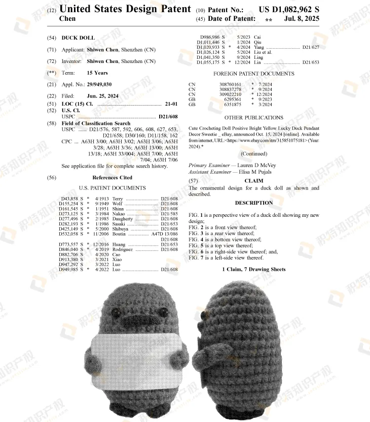 今年针织玩偶外观专利下证堪称“井喷”,其中还有产品刚下证不久便发起TRO维权,比如以下月销7K+的小黄鸭针织玩偶,涉案专利号USD1082962S: