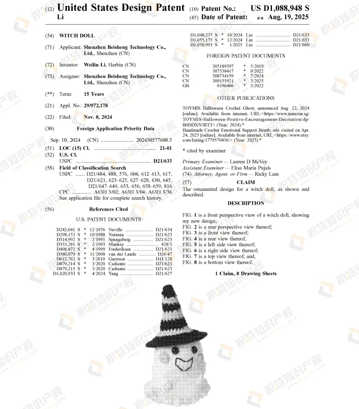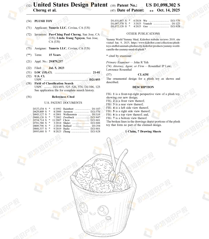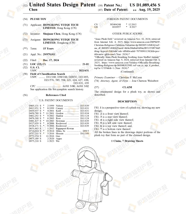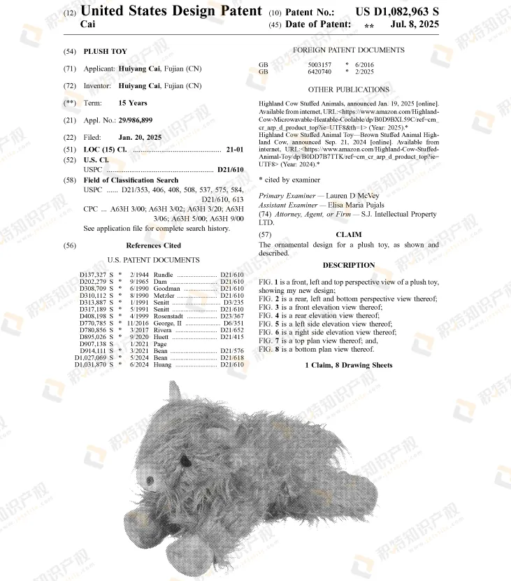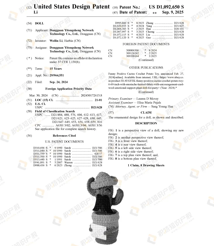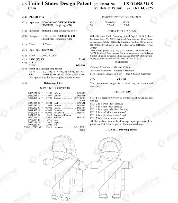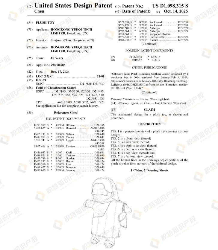 今年针织玩偶外观专利下证堪称“井喷”,其中还有产品刚下证不久便发起TRO维权,比如以下月销7K+的小黄鸭针织玩偶,涉案专利号USD1082962S:
