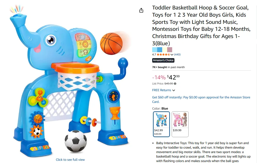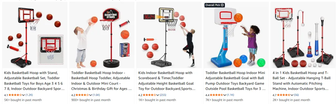 篮球架玩具既能让孩子释放精力,又能促进大运动发展培养运动兴趣,是不少家庭会选择的儿童成长玩具,亚马逊上不少产品热销。