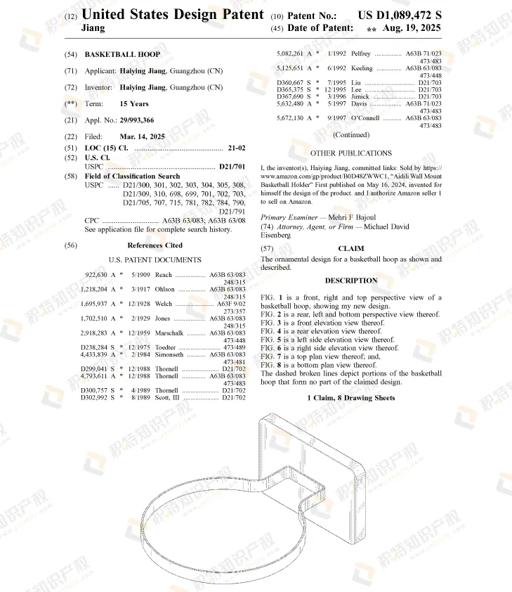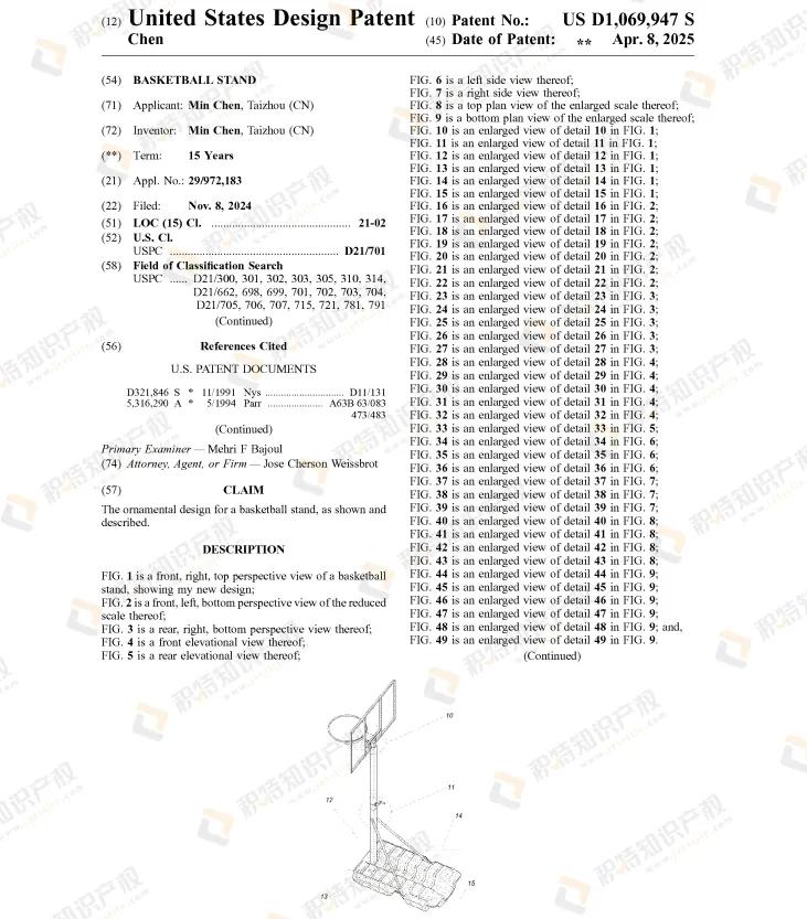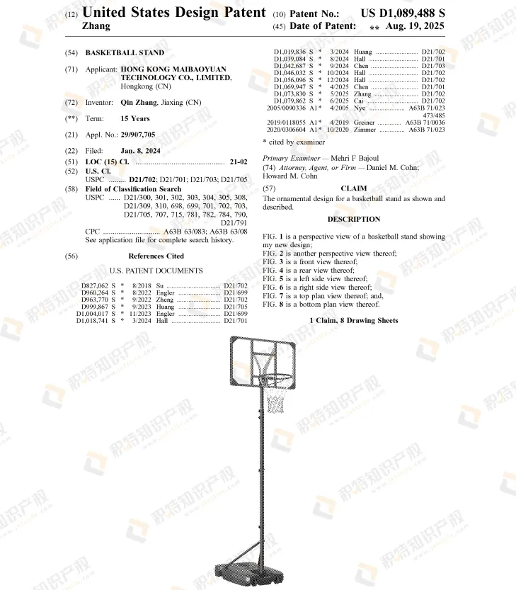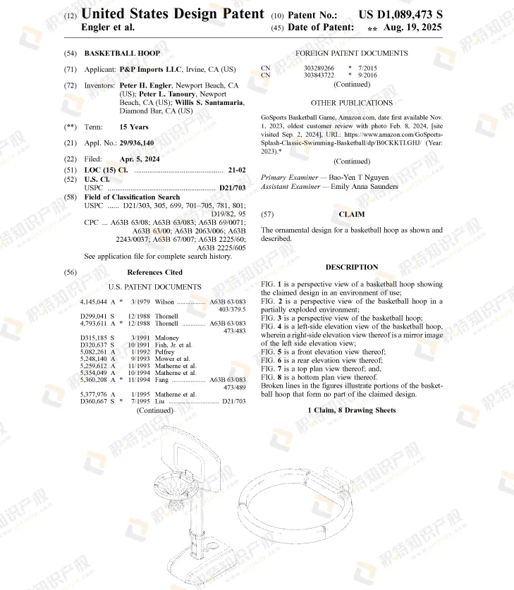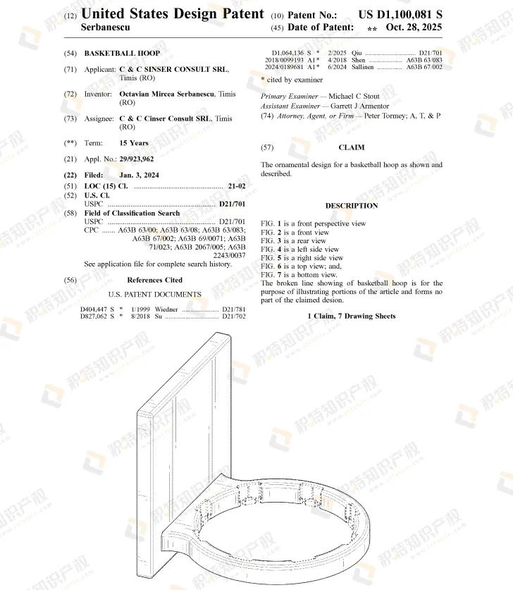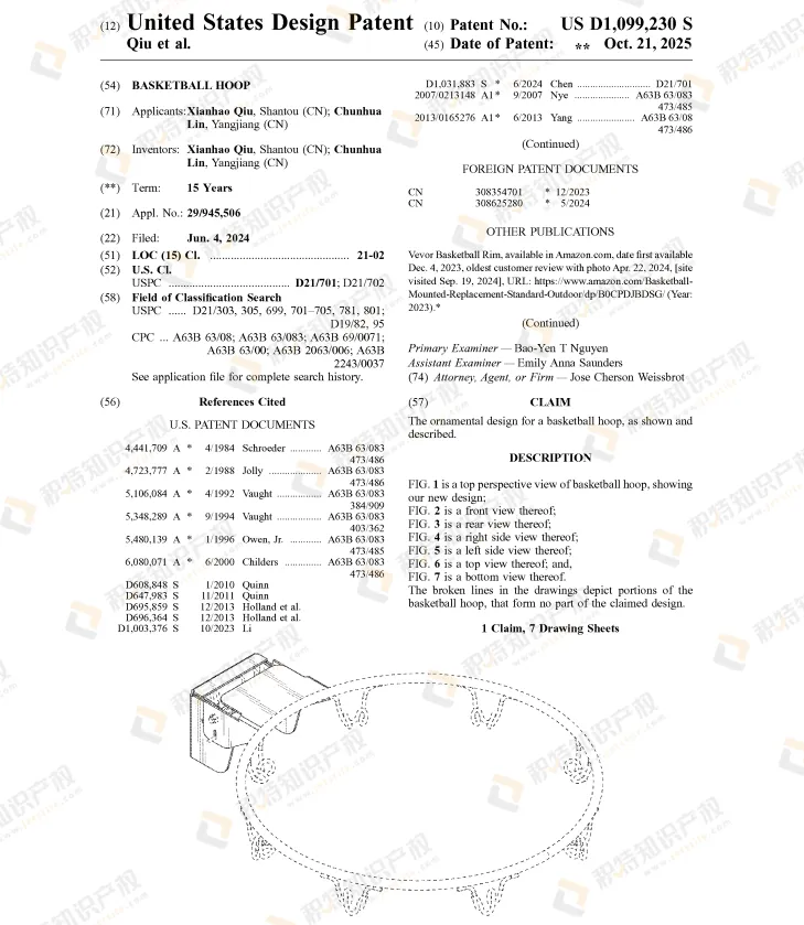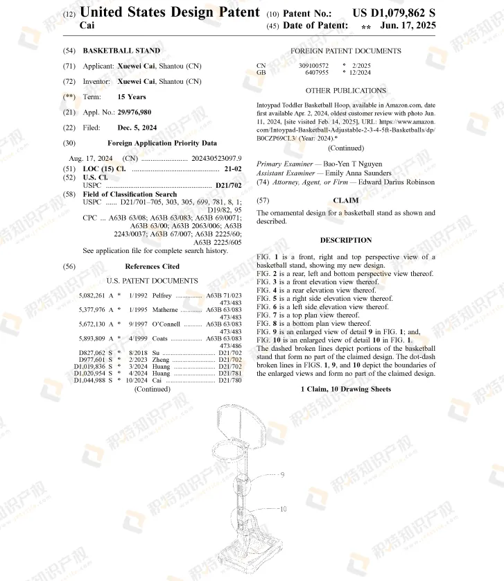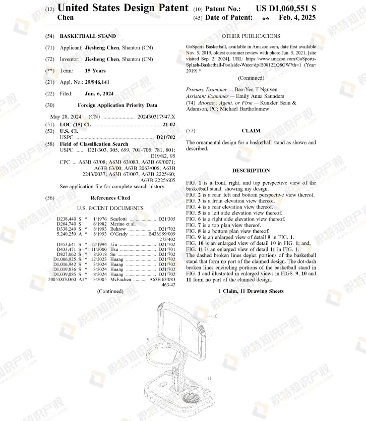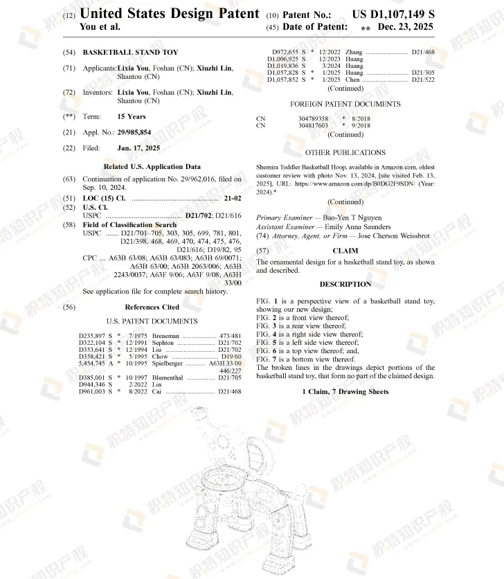 不少篮球架玩具已有美国外观专利,比如以下这款热销产品就于2025年12月23日下证专利,专利名称Basketball stand toy,专利号USD1107149S,2025年1月17日申请: