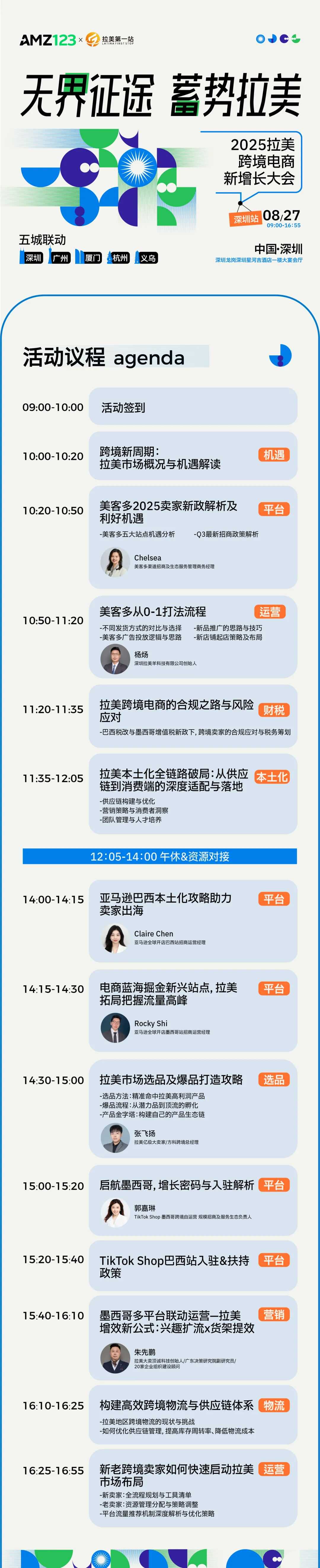 大会议程将全面覆盖拉美市场的机遇与挑战。从市场概况解读到新政解析,从运营打法到合规风险应对,大会将深入探讨拉美电商的全链路破局策略。此外,参会嘉宾还将分享亚马逊巴西和墨西哥的本土化攻略,TikTok Shop的入驻政策,以及多平台联动运营的增效新公式。