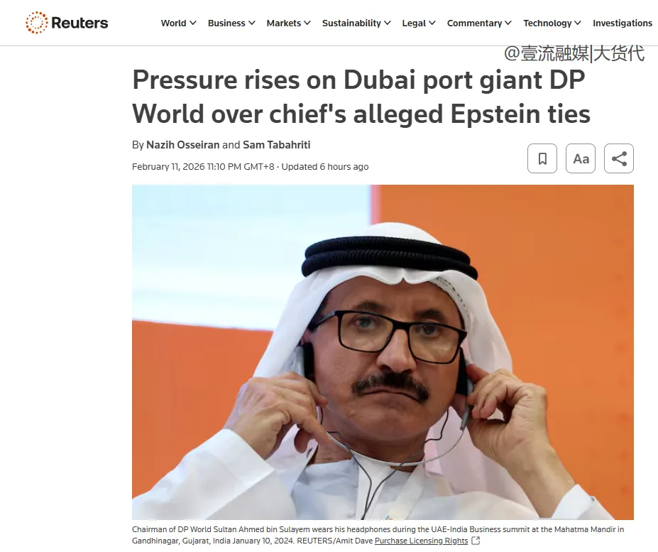 根据路透社报道显示,在美国司法部披露的文件中,DP World董事长兼首席执行官苏拉耶姆和爱泼斯坦,在十多年里一直保持着密切的关系——这些文件包括电子邮件和短信,其中似乎显示着两人之间讨论过生意、谈论过性以及计划前往爱泼斯坦在加勒比海的岛屿等事项。
