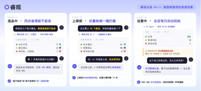 “我让他们给我试了一周。”李志远说,“当时我们把30多款待上架产品全部丢进去跑了一遍,结果筛出来9款有问题——有两款的图片里出现了别人的注册商标,有三款的标题里用了某个大牌的关联词,还有两款的外观设计跟现有专利有重叠。其中有一款是我们的运营主管准备重点推的,广告计划都做好了。如果没查出来,可能就是下一个TRO。”