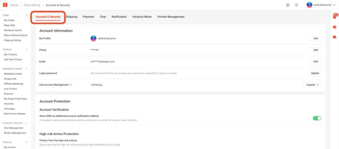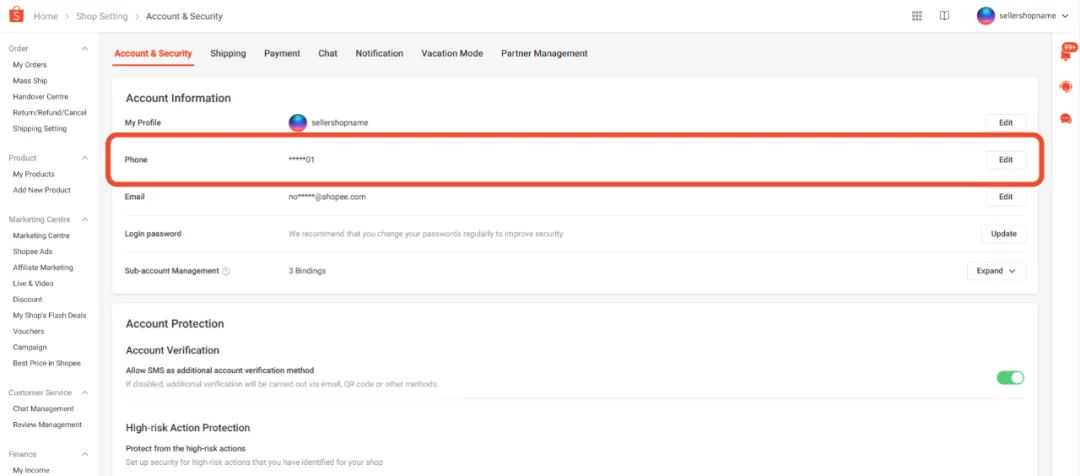 1. 在卖家中心,进入店铺设定>帐户与安全。在账户信息下,编辑您的电话号码。