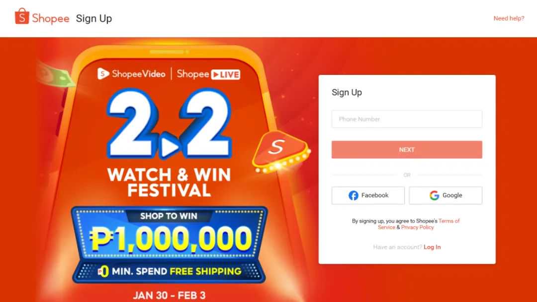 1. 在 shopee.com 点击注册(Sign Up)创建一个账户,您可以使用手机号码或您的 Facebook、谷歌或苹果账号注册。