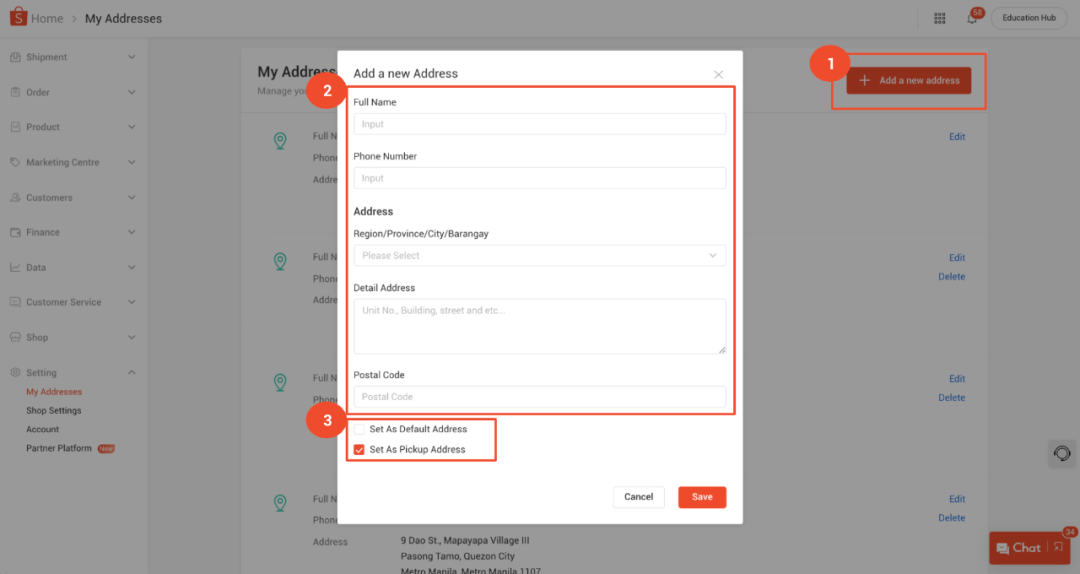 2.点击 1) + 添加新地址,2) 填写联系人和地址详细信息,然后 3) 点击设为取货地址。: