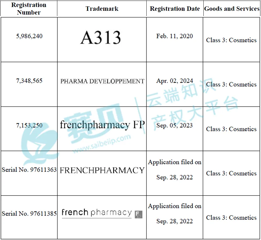 此次发起TRO诉讼,维权的是 5 个美国商标,含A313、FRENCHPHARMACY FP、PHARMA DEVELOPPEMENT等 3 个已注册、及FRENCHPHARMACY、FRENCHPHARMACY FP等2 个申请中商标,全部覆盖第3类化妆品品类,部分还涉及零售服务。