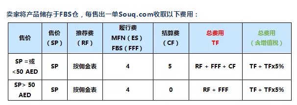 售价50AED以下的收取4AED履行费+5AED结算费=9AED