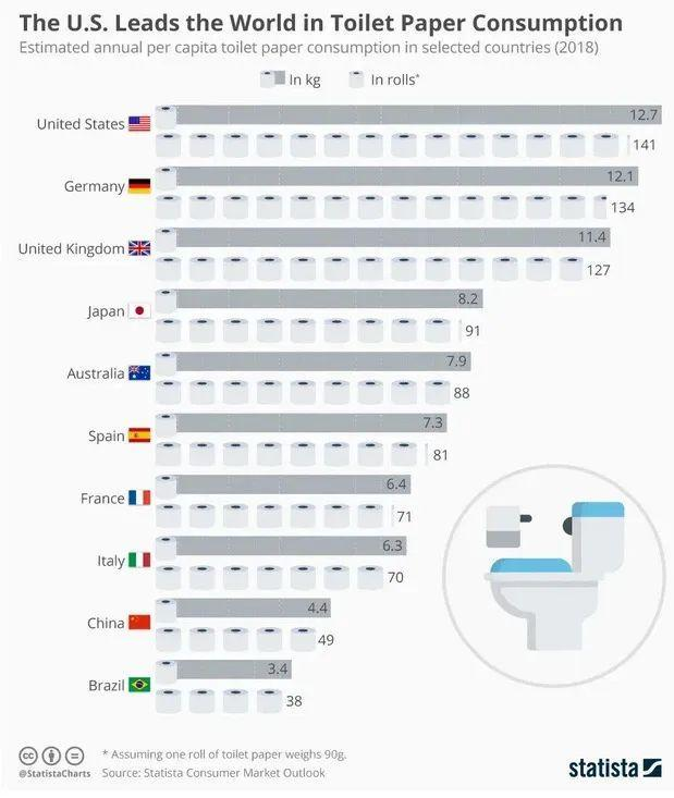 Statista有数据表明,美国人真的是厕纸消费的冠军,每人每年使用141卷厕纸,平均每两天半就用掉一卷厕纸。