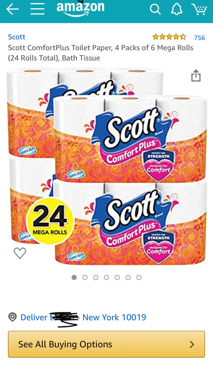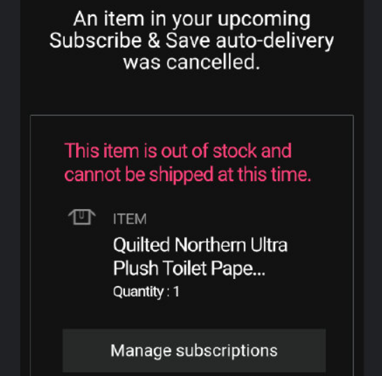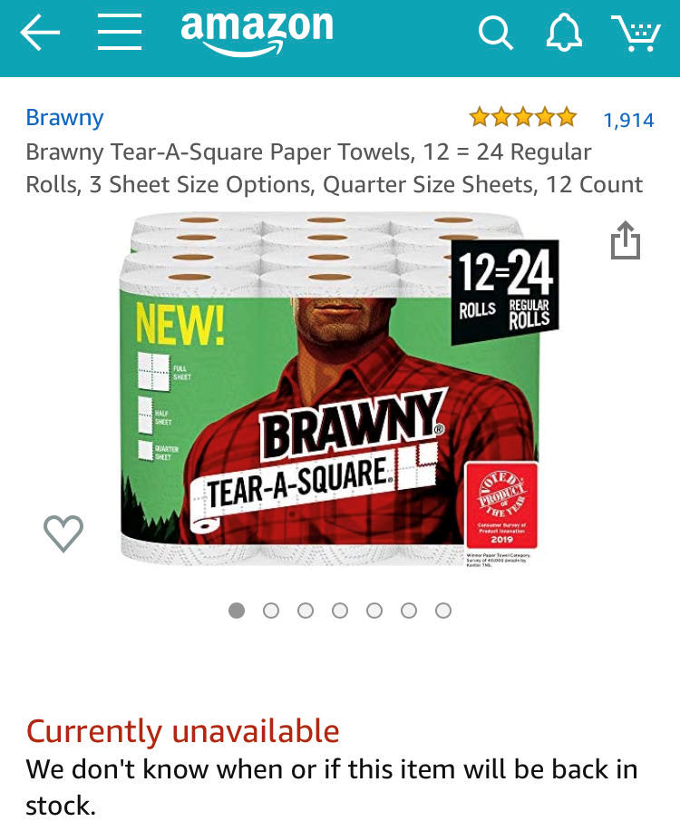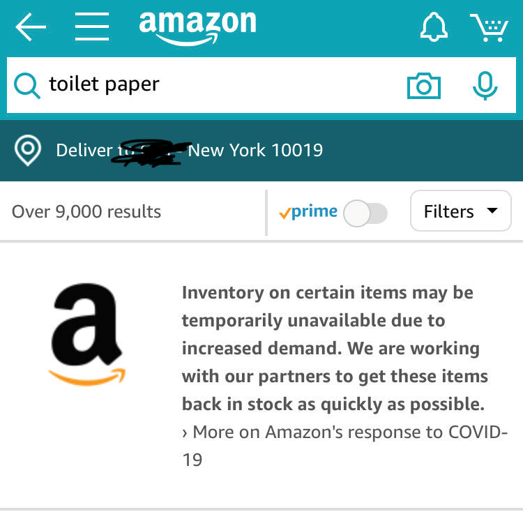 亚马逊不得不在搜索页顶部告知消费者,由于需求大量上涨,厕纸库存可能不足。