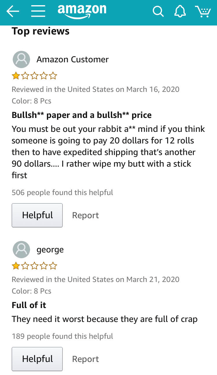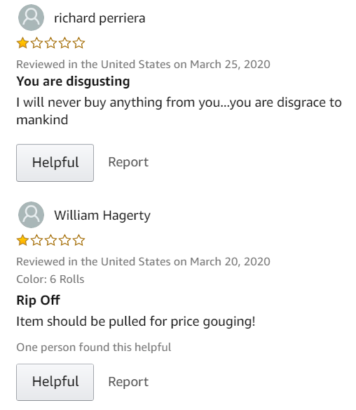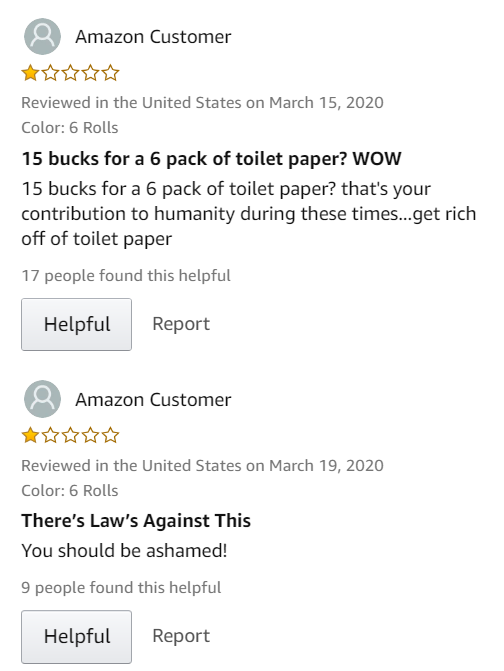 但疫情期间厕纸价格卖贵了,卖家就会被骂得很惨。好几个厕纸listing下都有一星评论,有一个产品竟然是全一星:几乎都在骂价格卖得高!