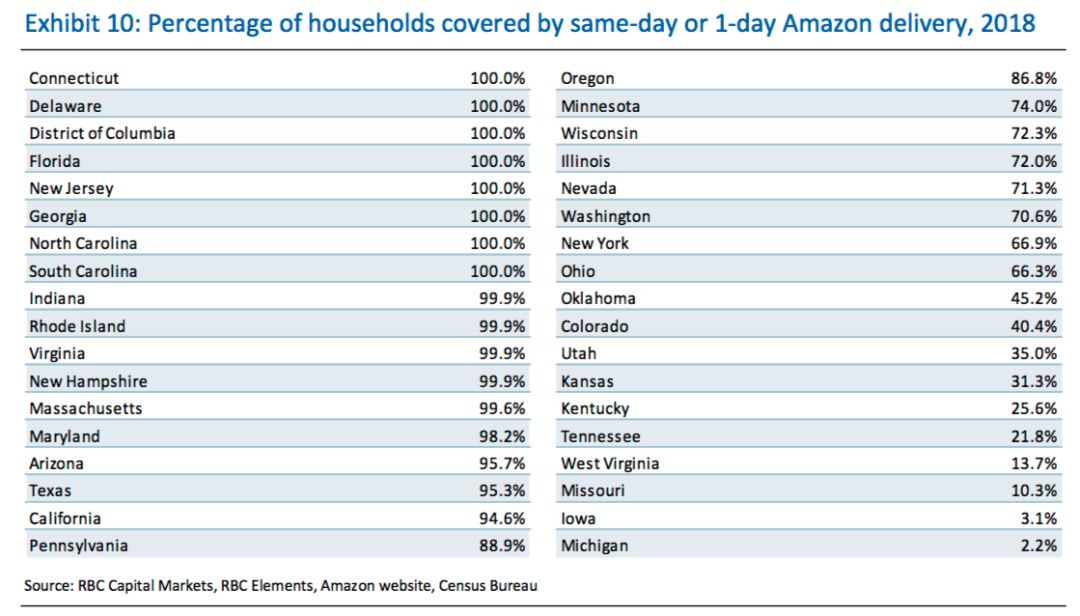 到今天为止,Amazon的1天达和当日达,已经可以覆盖美国72%的人口;而在16个最富裕和人口密度最大的州,Prime 1天达服务可以覆盖这些州95%的美国家庭(参见下表)