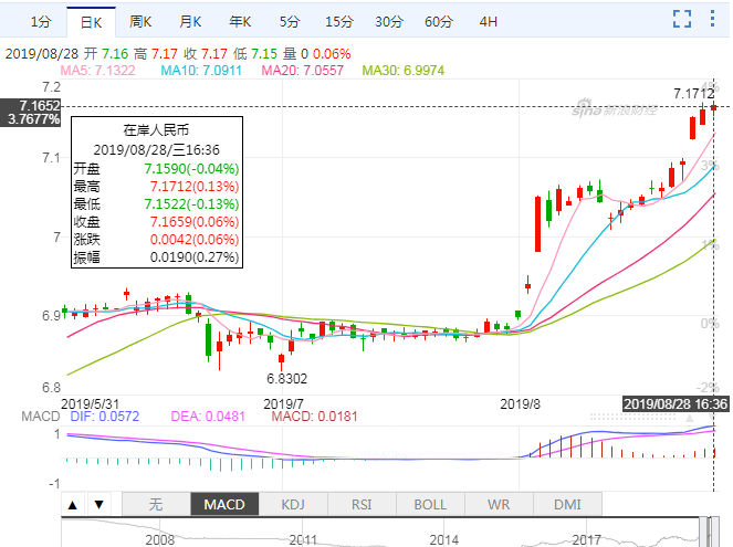 8月26日,离岸人民币对美元汇率开盘即报7.1751,较前一交易日7.1355的收盘价重挫近400点,随后离岸人民币对美元汇率在一度贬值至7.1835后反弹。