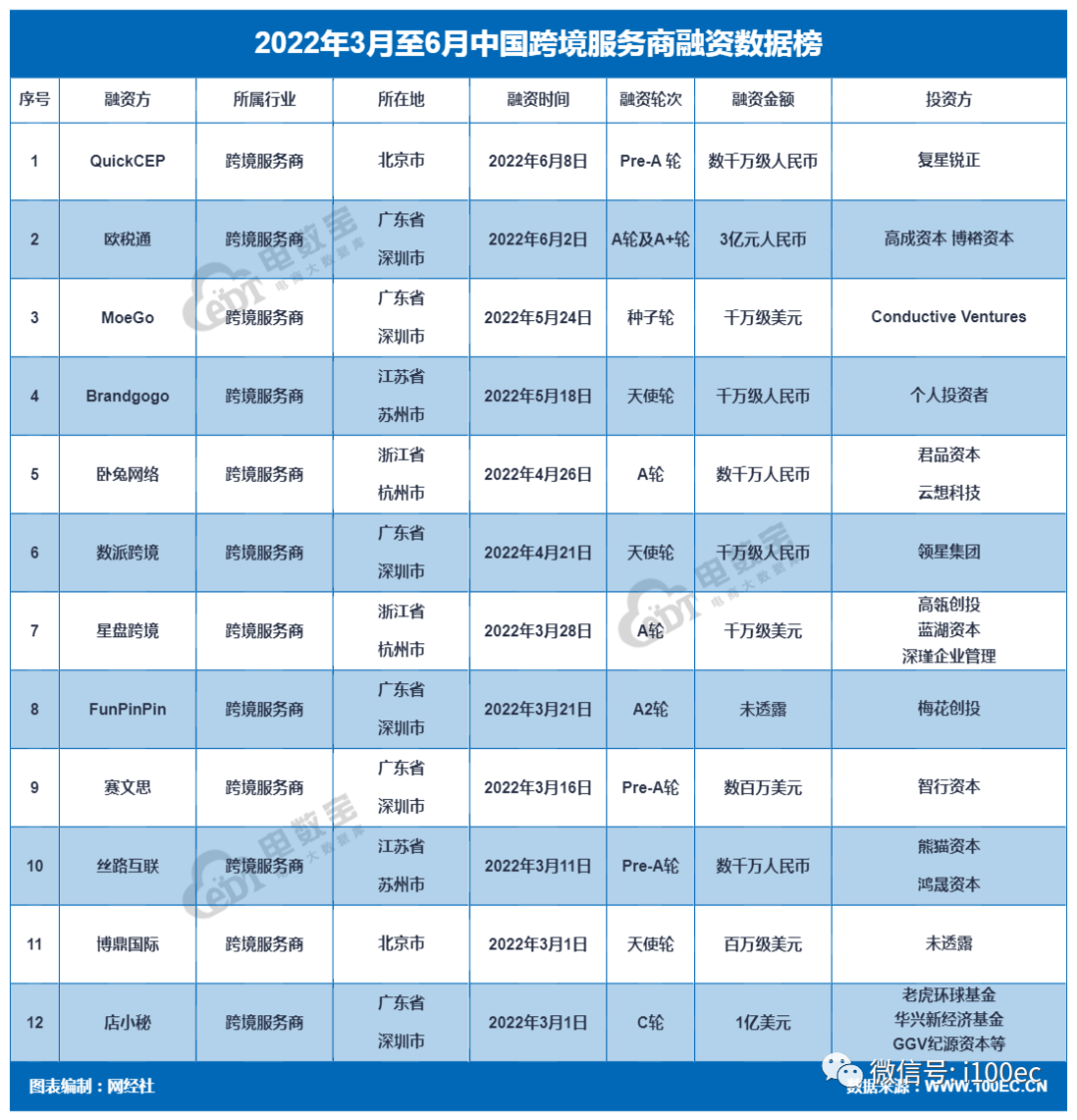 据“电数宝”电商大数据库(DATA.100EC.CN)显示,2022年3月至2022年6月,国内跨境服务商领域共发生了12起投融资事件,涉及的公司包括:QuickCEP、欧税通、MoeGo、Brandgogo、卧兔网络、数派跨境、星盘跨境、FunPinPin、赛文思、丝路互联、博鼎国际、店小秘等。