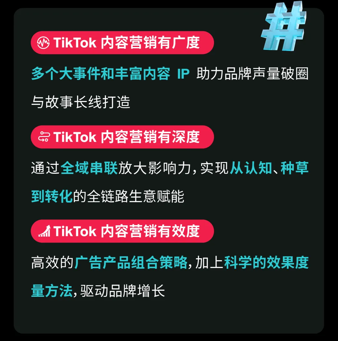 为了帮助品牌深入当地做好内容营销,实现品效双收,TikTok for Business 也准备了完备的营销资源,通过以下三大层面的优势助力品牌全球增长。