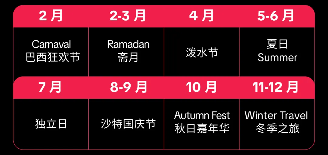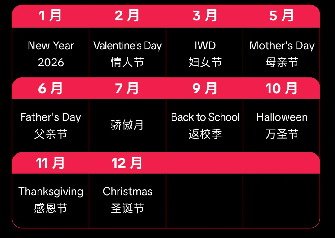 围绕 2026 年全球核心节日节点,依托 TikTok 平台生态打造适配各节日的 IP 营销内容,聚焦全年 10+ 高热度节日,实现全年热点场景的精准覆盖与用户互动。