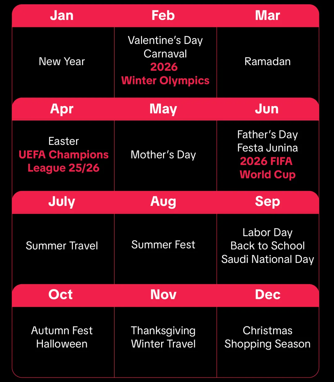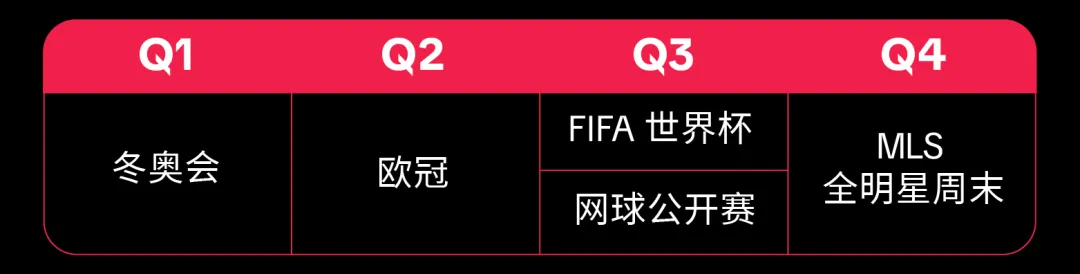 围绕 2026 年冬奥会、欧冠、世界杯等全球核心体育赛事节点,打造适配各赛事场景的 IP 营销内容,实现全年体育热点的精准联动与用户互动。