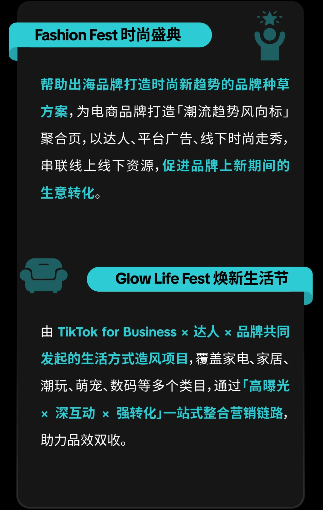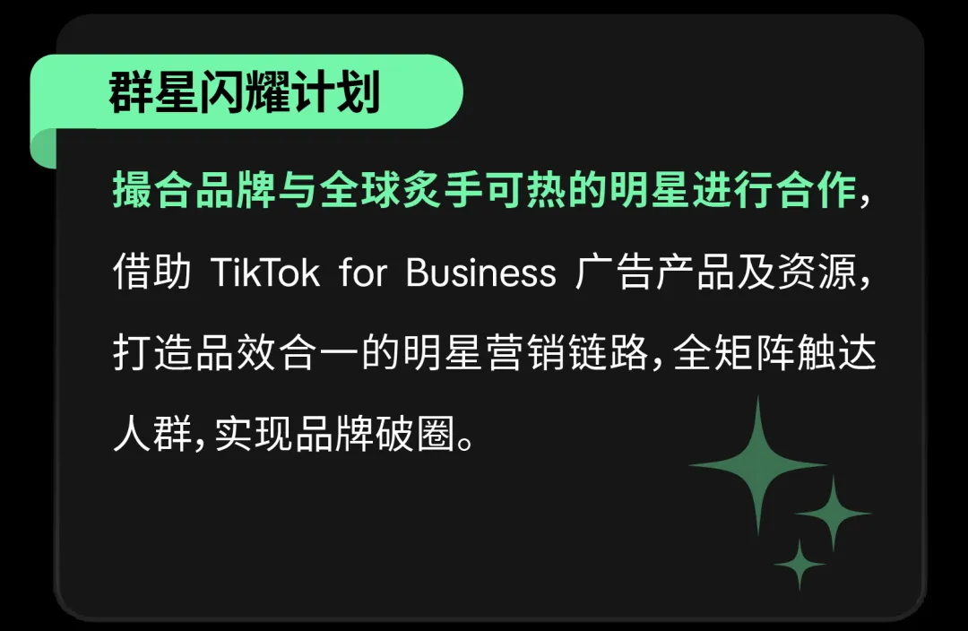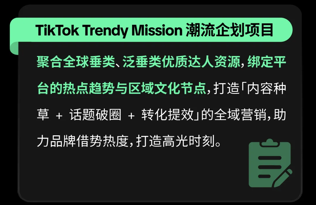 包含 TTPS 一站式达人解决方案、TikTok Trendy Mission 潮流企划项目、群星闪耀计划、TikTok Short Drama Craze 短剧植入营销、TikTok Inspiring Moment 闪耀时刻互动项目等项目,品牌可按需选择: