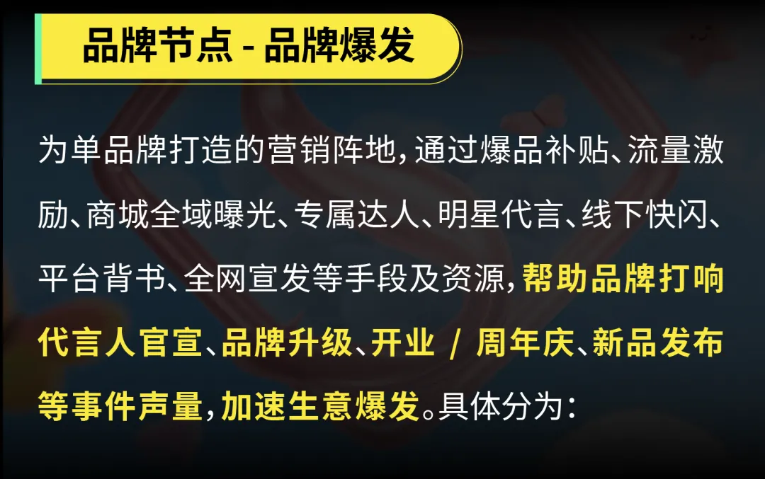 项目依托电商场景,紧扣以下三类生意节点,构建不同经营模式,整合线上线下多样化种草及转化资源,帮助品牌抓住节点机会,实现爆发增长。