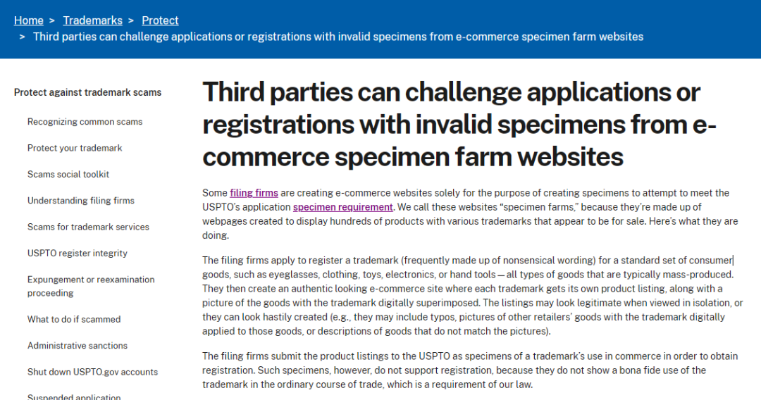 在商标注册过程中,提供真实有效的使用证据是一项核心要求。然而近年来,部分企业及代理机构为规避美国专利商标局(USPTO)对商标真实使用的严格审查,通过设立虚假电子商务网站,即所谓的“证据农场”(specimen farms),系统制造并提交虚假使用证据,以此不正当手段获取商标注册。