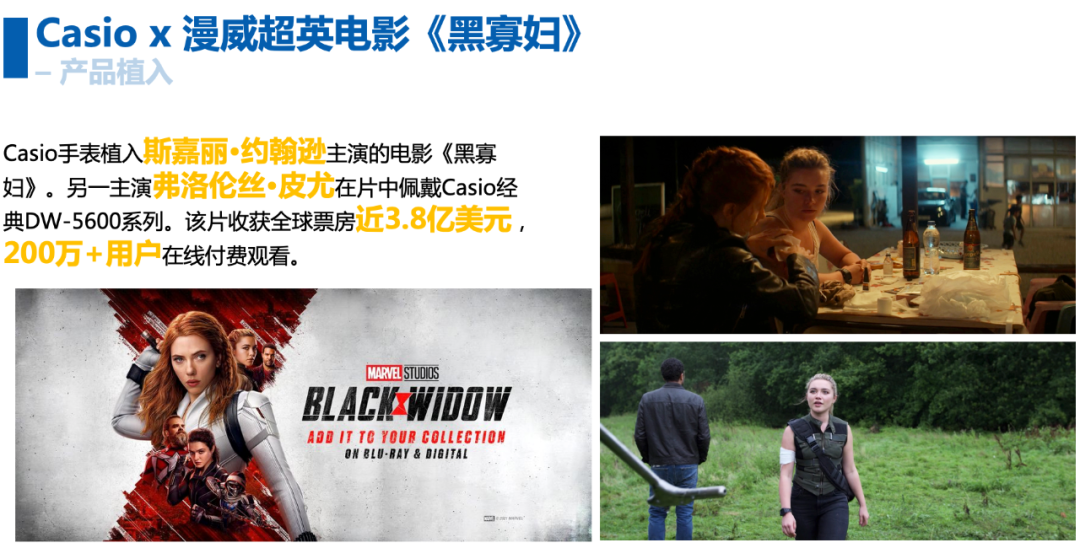 黑寡妇斯嘉丽与产品一起出现的场景大量出现。