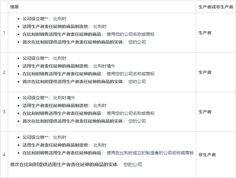 如果您使用您的公司名称或商标在比利时销售或转售适用生产者责任延伸的商品,且您是首次在比利时提供适用生产者责任延伸的商品的实体,则您被视为生产者。
