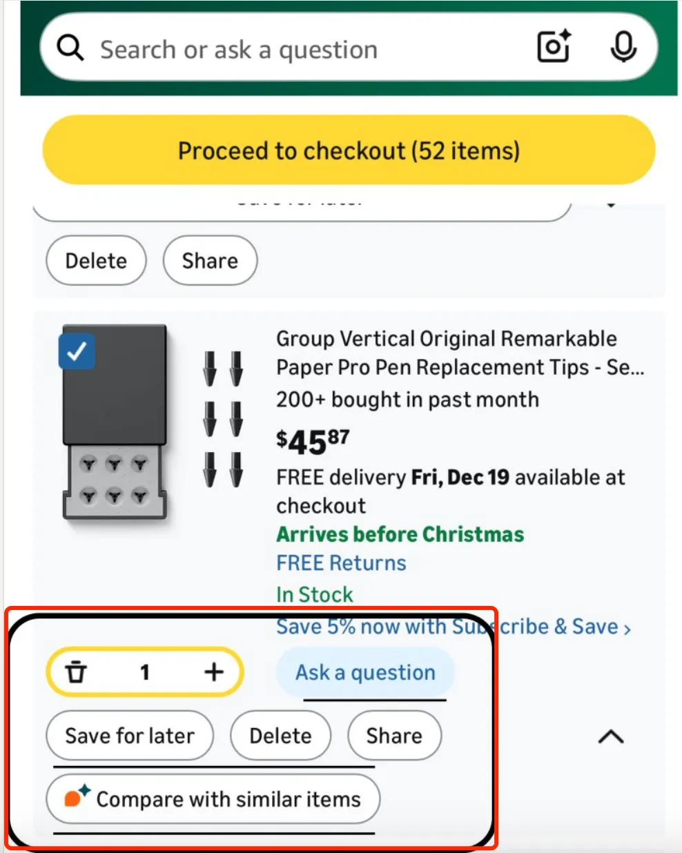 在购物车页面,消费者现在可以直接从购物车 UI 调用 Rufus,围绕“相似商品”的对比视图,快速做评估,是付款,还是换一个。