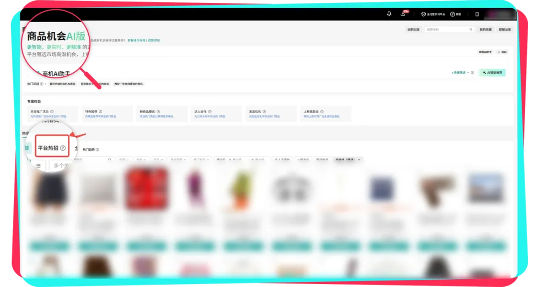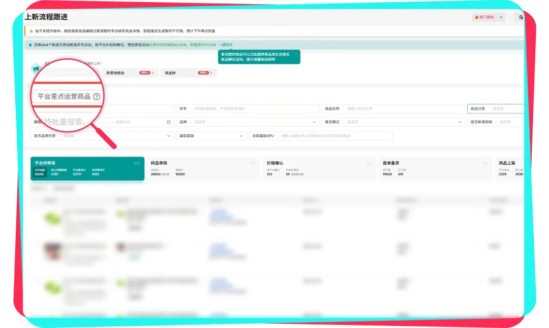 • 通过“上新流程跟进”进行快速筛选,或在“商品异常管理”异常问题待处理时被标记为“平台重点运营商品”,自行识别商品是否符合新奇特货盘